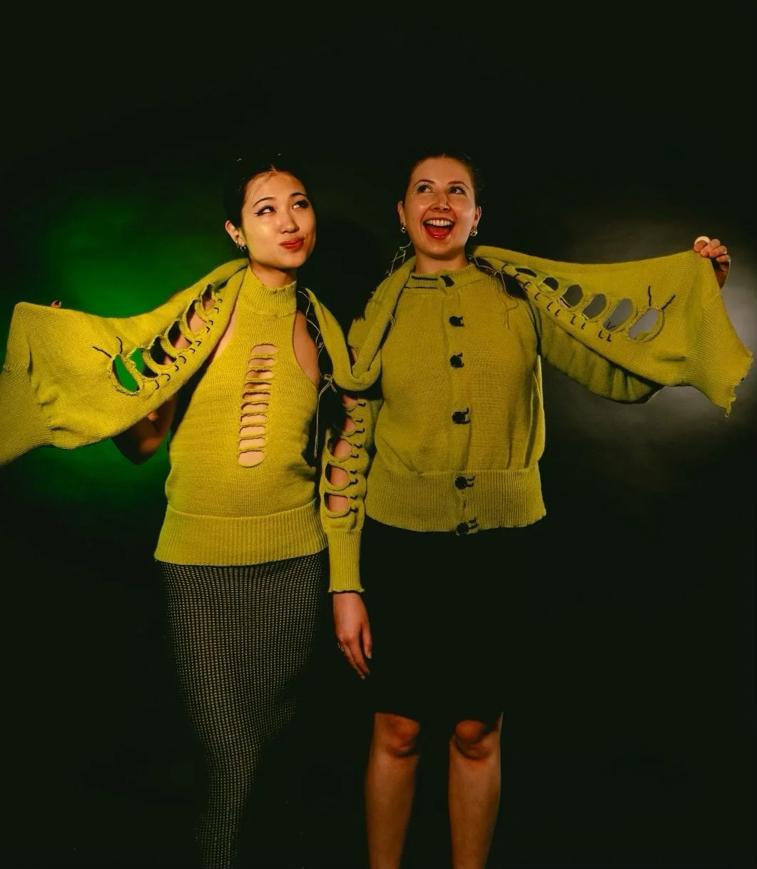 After constructing each piece, I explored methods to connect the front panels in a way that replicated the cutout pattern, utilizing the natural roll of the jersey fabric. Initially considering bows for this purpose, I found that they didn't produce the desired outcome, so I transitioned to buttons, enhancing them with additional embroidery to make a sideways caterpillar.